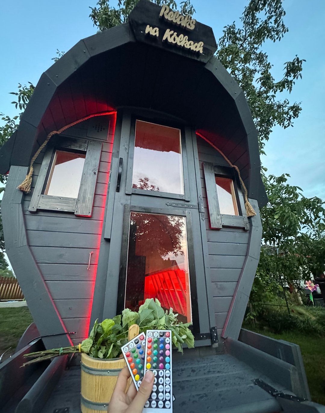 Pod osłoną 🌃 nocy nasza mobilna sauna wygląda równie zjawiskowo!