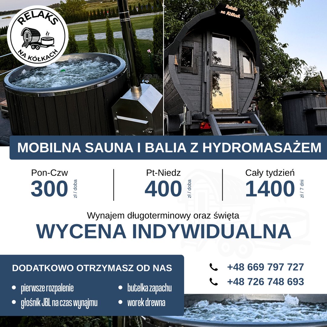 Mobilne SPA z dostawą pod Twój dom! "Relaks na Kółkach" to mobilna sauna i balia z hydromasażem na wynajem. Działamy w Koninie oraz okolicy do 50km. Oferujemy wynajem na doby oraz wynajem długoterminowy. W ofercie mobilna sauna, mobilna balia z hydromasażem oraz bania do schładzania ciała. Zapewniamy kompleksową obsługą od transportu po pierwsze rozpalenie i instrukcję użytkowania. W cenie otrzymują Państwo worek drzewa, olejek zapachowy oraz bezprzewodowy głośnik JBL na czas wynajmu. To świetne rozwiązanie na imprezę, wieczór panieński oraz spotkanie ze znajomymi. Marzysz o niezapomnianej chwili relaksu? To coś dla Ciebie! Zadzwoń, aby poznać szczegóły i zarezerwować termin +48 669 797 727 lub +48 726 748 693. Do usłyszenia!